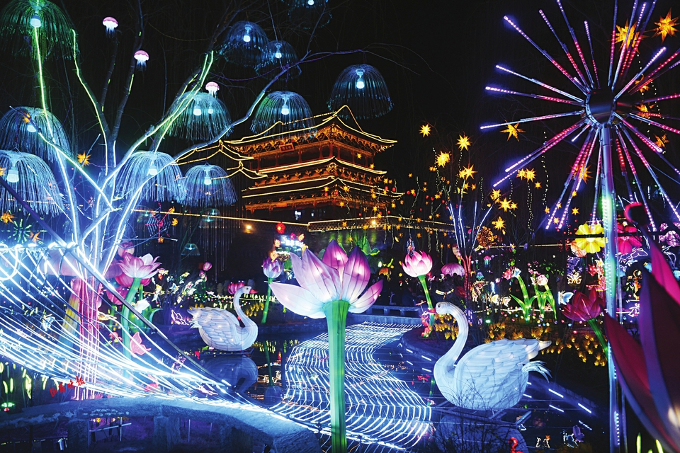 在太原钟楼街,古色古香的街巷里人们摩肩接踵,各种市集摊位、老字号门前排起长队;夜幕降临,运城池神庙上演了一场流光溢彩的视觉盛宴,璀璨的千灯会点亮夜空,各式花灯异彩纷呈,游客们穿梭于灯海,举家拍照,定格团圆瞬间;在吕梁碛口古镇,黄河岸边的民俗表演轮番上阵,引得观众阵阵喝彩;在有着“古堡民居第一县”美誉的阳城,非遗与现代擦出别样火花;皇城相府内,上党梆子与现代灯光秀同台竞演。