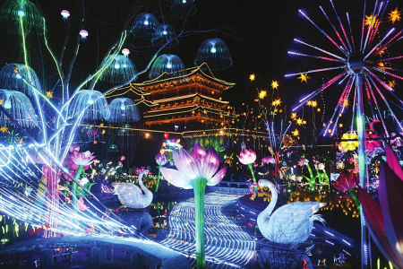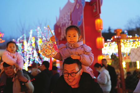 7.正月初三,阳城县润湖公园,家长带着孩子赏花灯。