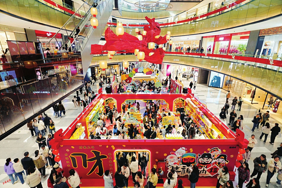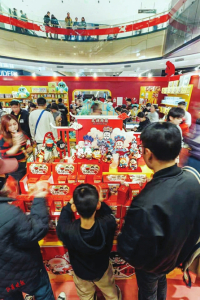 “说实话,我本来是和闺蜜来逛街吃饭的。”坐在商场休息区的90后姑娘小王向记者展示了她的“战利品”——一只驮着金元宝的“马上发财”毛绒挂件。“这个挂件很抢手,我排了半小时队。”她的话引得周围几位年轻人会心一笑。