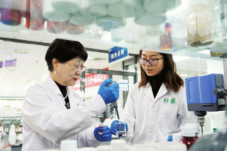 • 渠志灿(左)与团队成员进行实验操作。