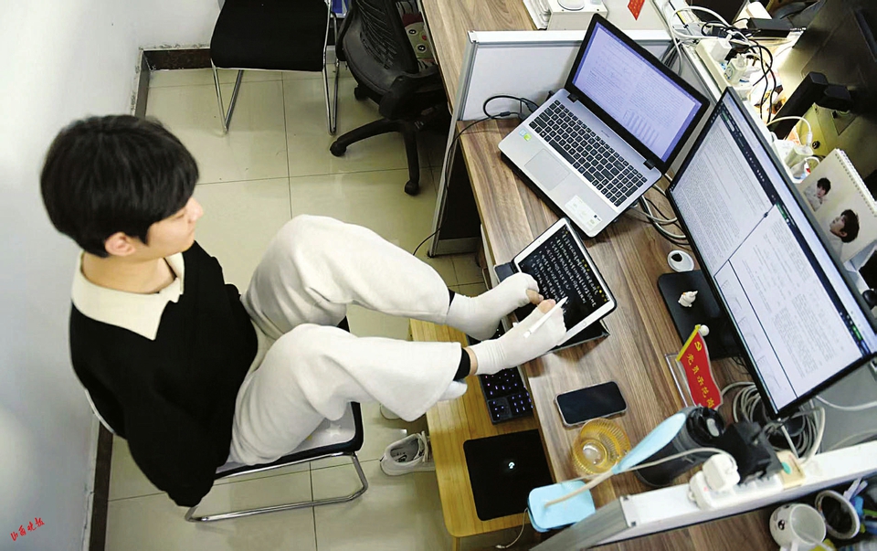 • 王海港用脚趾夹着笔在平板上写字,为研究的课题做准备。