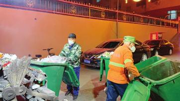 环卫工郝师傅和闫师傅是搭档,这一天,他们和往常一样,凌晨3时左右出门,4时准时发动垃圾清运车。身着橙色的工作服,口罩遮住了大半张脸,郝师傅推起一只绿色的垃圾桶,熟练地将桶沿卡上车后的挂钩,闫师傅按下操作杆,垃圾倾泻进压缩箱。